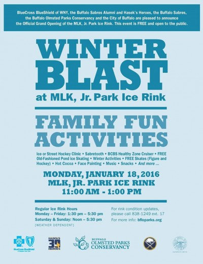 BlueCross BlueShield of Western New York, Buffalo Sabres Alumni and Hasek's Heroes, the Buffalo Olmsted Parks Conservancy, the Buffalo Sabres, Mayor Byron W. Brown and the City of Buffalo will all be at this Grand Opening Celebration at Martin Luther King, Jr. Park Ice Rink for a fun-filled Winter Blast - on Martin Luther King Day!