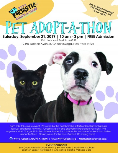 Please join WNY Furtastic on Saturday September 21st from 10am – 3 at the Pvt. Leonard Post Jr. 2450 Walden Ave, Cheektowaga, New York 14225. WNY Furtastic is a 501c3 that has put forth a collaborative effort joining local animal groups, rescues and fosters networks in a fun and enjoyable experience you can’t find anywhere else! Our goal is to find forever homes for a substantial number of animals in a limited amount of time.