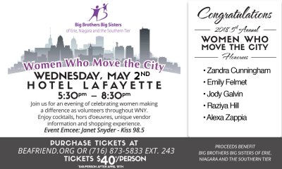 Join us to celebrate women being recognized for their volunteer efforts that make WNY a better place to live and work at the 5th Annual Women Who Move the City event to benefit Big Brothers Big Sisters. Your ticket includes hors d’oeuvres, 2 hours of open bar, unique vendor shopping and info tables, a swag bag filled with goodies plus, a chance to win door prizes! Janet Snyder of Kiss 98.5 will present the awards to this year’s outstanding honorees. Tickets are just $40 if purchased by April 15th and $45 after that date.