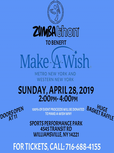 Sports Performance Park in the Eastern Hills Mall will be sponsoring a ZUMBA-THON to benefit The Make-A-Wish Chapter in WNY. Sunday April 28th 2pm - 4pm. Doors open at 11am. Basket Raffles. 100% proceeds go to Make A Wish.