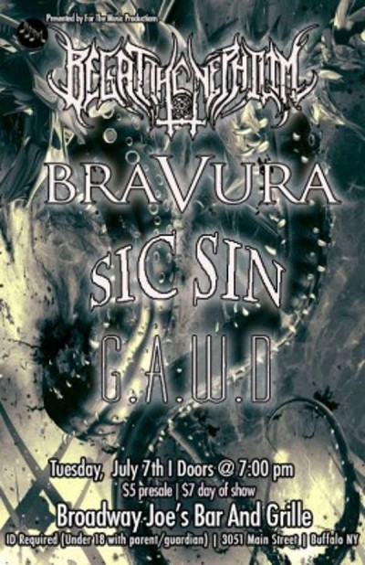 For The Music Productions Presents: Begat The Nephilim [Extreme Metal out of Southern NH!] Bravura [Technical Progressive Metal out of Erie, PA!] Sic Sin [Killer Buffalo Metal/Hard Rock Veterans] GAWD [4 dirty bastards who love to party & get heavy] Tuesday, July 7th $5.00 pre-sale, $7.00 day of show Ages 18+ (Valid ID Required) Doors open at 7:00pm Tickets on sale at: http://mapleentertainment.com/event.cfm?id=210234 at: Broadway Joe's Bar & Grille 3051 Main St Buffalo, NY 14214