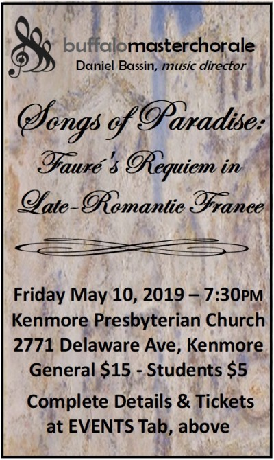 The Buffalo Master Chorale concludes its dynamic 2018-2019 season with one of the all-time masterworks for voices and instruments, the Requiem Mass of Gabriel Fauré. We feature this work in its original setting for choir and small orchestra on a program that celebrates the musical legacies of late-romantic French master composers. The music of Fauré’s predecessor as organist of Paris’s La Madeleine, Camille Saint-Saëns will also be heard alongside works by Fauré’s great pupil, Lili Boulanger – the first woman to win the Prix de Rome – and that of her sister, Nadia, the 20th century’s most important composition teacher.