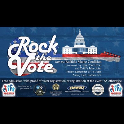 The Buffalo Music Coalition presents Rock the Vote at Babeville with Ten Cent Howl and Critt’s Juke Joint. Free admission with your voter registration card or if you register on the spot with the Erie County Board of Elections. Or pay only $5 at the door.