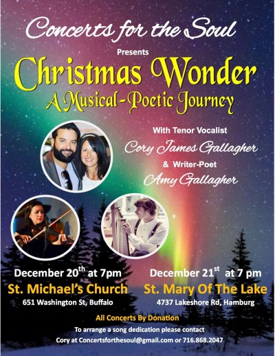 We are offering the opportunity to dedicate a song to your departed loved ones and have them included in our “Christmas Angels” segment of the concert. Please email: concertsforthesoul@gmail.com Or call/text: 716-868-2047