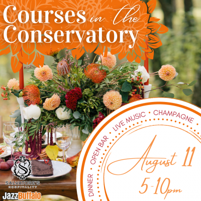 Begin your evening with a selection of seasonal passed appetizers and cocktails beside our magnificent indoor waterfall and then enter our newly renovated outdoor courtyard for your main course. Enjoy a family-style meal at sunset accompanied by live music from JazzBuffalo.