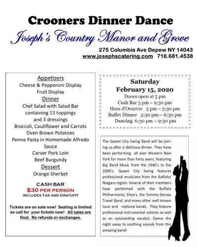 The Queen City Swing Band will be joining us after a delicious dinner. They have been performing all over Western New York for more than forty years, featuring Big Band Music from the 1940’s to the 2000's. Queen City Swing features professional musicians from the Buffalo/Niagara region. Several of their members have performed with the Buffalo Philharmonic, Shea's, the Tommy Dorsey Travel Band, and many other well known local and national bands. They feature professional instrumental soloists as well as an outstanding vocalist. Dance the night away to soothing sounds from this amazing band!
