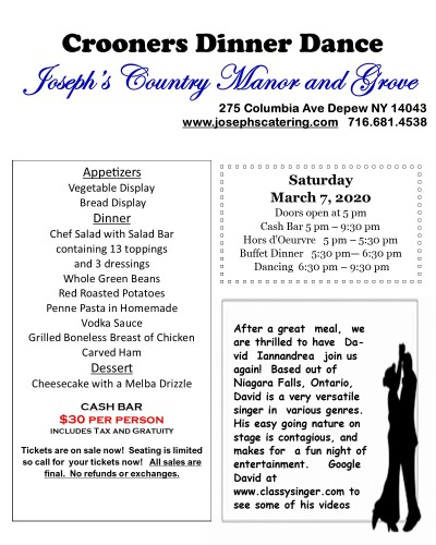 After a great meal, we are thrilled to have David Iannandrea join us again! Based out of Niagara Falls, Ontario, David is a very versatile singer in various genres. His easy going nature on stage is contagious, and makes for a fun night of entertainment. Google David at www.classysinger.com to see some of his videos.