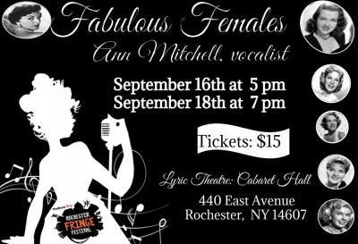 Rochester, NY – Ann Mitchell will perform Fabulous Females at the 2018 KeyBank Rochester Fringe Festival on Sunday, Sept. 16th - 5:00pm and Tuesday, Sept. 18th - 7:00pm at the Lyric Theatre Cabaret Hall (440 East Avenue, Rochester). Tickets are $15 at where more information is also available. Remaining tickets will be available at the door starting one hour before curtain.