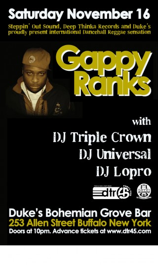 Deep Thinka Records, Duke's Bohemian Grove Bar and Steppin' Out Sound proudly present International Dancehall Reggae sensation GAPPY RANKS making his Buffalo debut in support of his new album "Shining Hope". Saturday November 16 at DBGB.