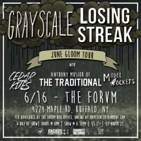 4224 Maple Road Buffalo, NY 14226 THIS EVENT HAS PASSEDLittle over a year after their breakthrough debut EP ‘Leaving,’ Philadelphia rock/pop-punk outfit Grayscale still feel like they’re just getting started. “Growing up, we were unified through our own set of issues we all had and over the past year, seeing our music impacting kids and helping them through similar situations… that’s the thing I love more than anything about this band. And we feel like we’re just getting started” proffers vocalist Collin Walsh. In reality, writing and performing the songs was equally therapeutic for the band themselves, as bassist Derek Parker adds; “We’re more comfortable and confident as people and musicians. We’ve really learned why we picked up instruments as kids and why we want to do this.” With influences such as Brand New, Jimmy Eat World, and The Starting Line, songwriting is an integral craft for the young five-piece; “The new material is the most lyric-focused and diverse we’ve written, all while remaining deeply personal to us,” states guitarist Dallas Molster.