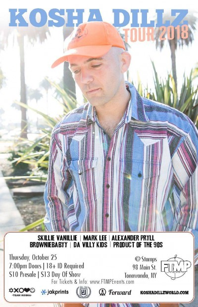 FTMP Events presents: Kosha Dillz & DEVMO w/ Skillie Vanillie, Mark Lee, Alexander Pryll, BrownieBabyy, Da Villy Kids, & Product Of The 90s * DJ NiTELiTE on the decks Thursday, October 25 Doors at 7:00 pm $10 Presale, $13 at the door Ages 18+ (ID Required / Strictly Enforced) Tickets: http://www.purplepass.com/KoshaDillz102518 at: Stamps... the bar 98 Main St. Tonawanda, NY 14150 / Keep updated on all the upcoming FTMP Events Website: www.FTMPEvents.com www.Facebook.com/FTMPEvents www.Twitter.com/FTMPEvents / Join our Email list: http://eepurl.com/KaCSX www.Instagram.com/FTMPEvents www.FTMPEvents.Tumblr.com www.facebook.com/groups/HelpBookBuffalo