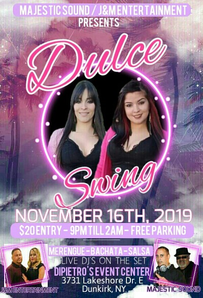 So don't miss this great event on November 16th, 2019 doors open at 9:00pm at the Dipietro's Event Center - 3731 Lakeshore Dr. E Dunkirk, NY 14048. There will also be Live Dj's as well drink specials and food specials all night long free parking. Ticket sales available at the door for only $20. So if you love to dance to Latin Music don't miss out on this great event.