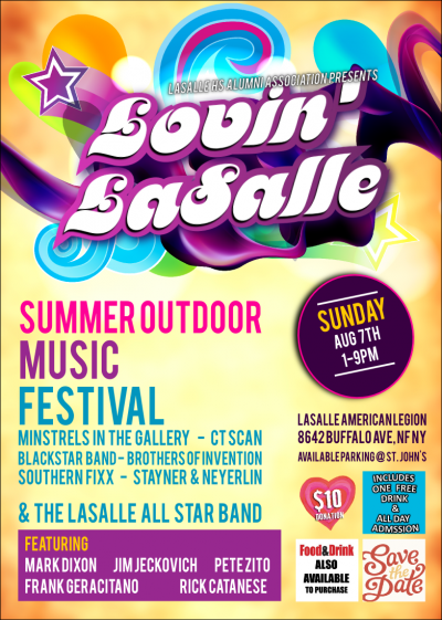 LaSalle High School Alumni is hosting their first Outdoor Music Festival with the purpose of keeping the LaSalle Explorer spirit alive and well in the Niagara Falls Community. $10 Donation includes one drink and all day pass of great music with 2 stages and 7 bands. Proceeds from this event will help plan other alumni events as well as give back to the LaSalle/Niagara Falls community through service or monetary donations. Come on out....meet up with long-time friends and listen to some of our finest musicians.