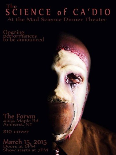 The evening features The Science of Ca'Dio, the story of a man and his struggles in a post-apocalyptic world surrounded by love and tragedy! Based on the book The True Survivors by John Harris, this show features an incredible soundtrack by industrial musician Razbaque Dirge along with eye-catching lighting displays and visuals! Come see the biggest little show in Buffalo in The Science of Ca'Dio at the Mad Science Dinner Theater!