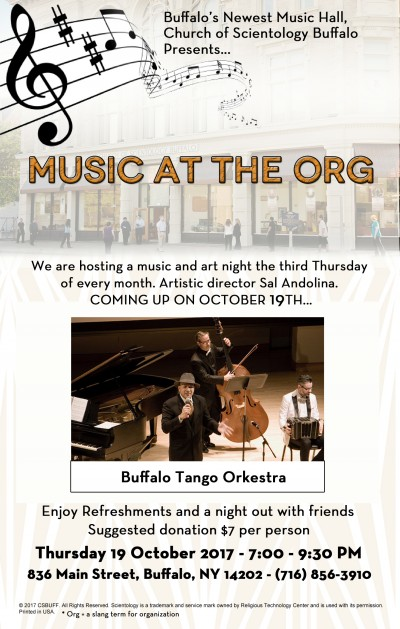 Buffalo's newest music hall at the Church of Scientology Buffalo presents Music at the Org. This is a music and art night that we are hosting the third Thursday of every month. The Artistic Director is Mr Sal Andolina of the Buffalo Philharmonic orchestra.