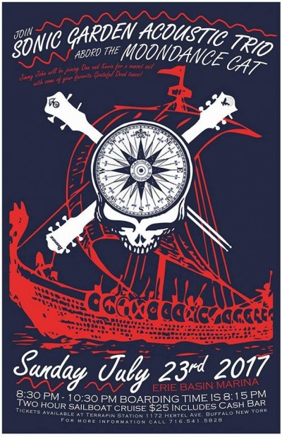 Join us for an early evening of sailing on the beautiful Lake Erie and the music of the Grateful Dead by Sonic Garden Acoustic Trio. Jimmy John will be joining Dan and Kevin for a sunset sail with some of your favorite Dead tunes. Tickets are $25 and seating is limited so get your tickets early. The boat leaves at 8:30pm Sharp so please be there by8:15pm to provide ample boarding time. There is a cash bar available with alcoholic and non alcoholic beverages and two public restrooms onboard.