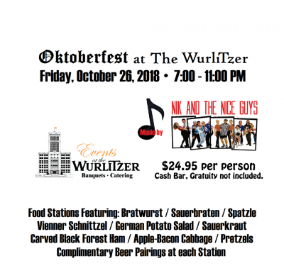 Book the last Oktoberfest party of the year! Join Events at the Wurlitzer for Oktoberfest on Friday, October 26, 2018, from 7 pm - 11pm. Music will be provided by Nik and the Nice Guys! Ticket includes food stations featuring: Bratwurst, Sauerbraten, Spaetzle Vinner Schnitzel, German Potato Salad, Sauerkraut, Carved Black Forest Ham, Apple-Bacon Cabbage, Pretzels and complimentary beer pairings at each station. Cash bar available.
