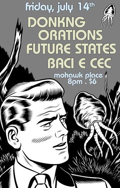 Spooky Buffalo indie shakers Orations bring their literate, haunting sounds to legendary music club Mohawk Place with special guests. Future States from Montreal play tasteful and refined pyschedelic pop. DONKNG from Gainsville, Florida offer raw art-inspired indie rock. Baci e Ceci is one of the many side projects of the talented husband-wife duo Kristen and Dave Gilmet.