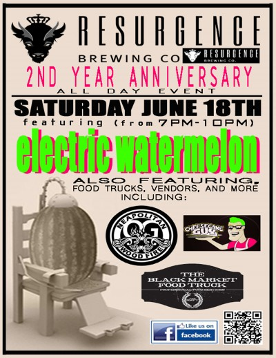 Resurgence Brewing Company’s 2nd Year Anniversary, an all-day event featuring live music, food trucks (including Black Market, OG Wood Fire, & Cheesecake Guy), vendors, and much more! Come help celebrate and have some fun! Alt-jam/indie rockers, Electric Watermelon will be performing from 7PM-10PM! SEE YOU THERE!