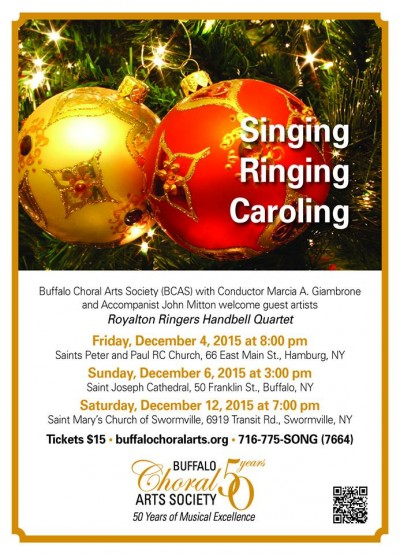 Buffalo Choral Arts Society (BCAS), under the direction of Marcia A. Giambrone, ushers in the holiday season by welcoming back guest performers the Royalton Ringers handbell quartet. Join us for an evening of festive music guaranteed to inspire and delight audiences of all ages. We offer familiar and new arrangements of your holiday favorites, arranged by John Rutter, Craig Hella Johnson, Dan Forrest and more!