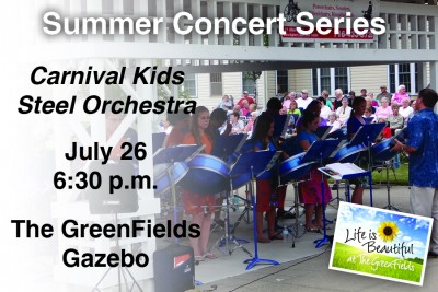 The GreenFields Continuing Care Community is hosting its annual Summer Concert Series, continuing with Carnival Kids Steel Orchestra on Wednesday, July 26 at 6:30 p.m at The GreenFields Gazebo.
