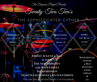 Twenty-Two Two’s: The Sophisticated Cypher features two emcees (Cashis Green & Prxfet), two vocalists (Dave Stewy & Shayla Billups), two poets (Jillian Hanesworth & Ben Brindise), and two musicians (sum’er & Kobra). One cypher. With opening acts 4-Blo, Kenyada Davis, Chellz and A.I.
