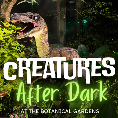 When the sun goes down, the creeping creatures and plants at the Botanical Gardens come to life for Creatures After Dark! See what happens to our collection of cool creatures and plants under spooky lighting. We'll have dozens of creatures made of LIVE plants including dinosaur succulent topiaries, a massive megalodon, a moss-made pterodactyl, a giant buffalo, a dragonfly, turtles, and more planty friends taking on new characters giving "plant-life" a whole new meaning! Looking for some real dinosaurs? Our friends from Past & Present will be showing off their life-size fossil casts including a giant T-Rex skull and a Triceratops skull and some life-like dinos hidden among the foliage.