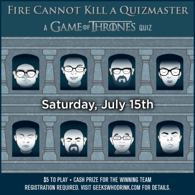 On Saturday, July 15th we’re headed back to the seven kingdoms to claim what is ours and bring you the 4th edition of Fire Cannot Kill A Quizmaster: A Game of Thrones Quiz! If you went to the others, don’t worry, this will be bloodier, geekier, and finished long before George R.R. Martin releases another book. Yes, we made that same joke last year. Yes, it’s still true.