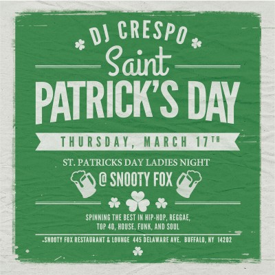 St. Patrick's Day lands on a Thursday this year! Every Thursday is Ladies Night at Snooty Fox Restaurant & Lounge. With a late night Kitchen that closes @ 1am, come expirerence great food and great music with DJ CRESPO @10pm.