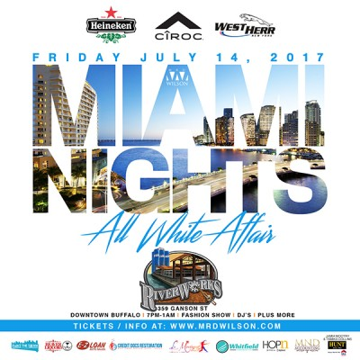The 8th Annual Miami Nights All White Affair is an annual All White Attire event presented by Dennis Wilson (owner of The Oakk Room Restaurant). The event features a fashion show, urban vendor market, multiple DJs, a cigar lounge on the patio and more. The event typically fdraws more than 1,000 guests from all over Buffalo and the East coast of the US.