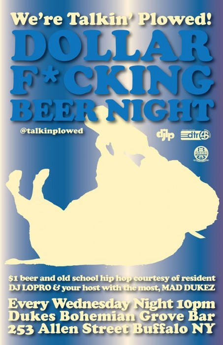 Borrowing from the classic 1980 Buffalo Area Chamber of Commerce's "Talking Proud" campaign and jingle, Talkin' Plowed Wednesdays is combining the love of our precious city and the love for cheap booze and good music. Plain and simple.