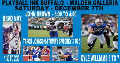 Several current and former members of the Buffalo Bills will visit Playball Ink, a new sports memorabilia store located in the Walden Galleria in Cheektowaga, for an autograph-signing event Saturday, Dec. 7. Playball Ink is located on the mall’s second floor near Macy’s.