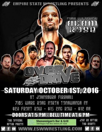 After another sellout crowd, Empire State Wrestling (ESW) comes back to the St. Johnsburg Fire Hall, located at 7165 Ward Road, North Tonawanda, NY, on Saturday, October 1, featuring former World Wrestling Entertainment (WWE) superstar Adam Rose. Bell time is set for 6 p.m. with doors opening at 5 p.m. Pre-sale tickets are $12.00 and can be purchased ahead of time online at eswwrestling.com. Tickets can also be bought at the door on the day of the event for $15.00.