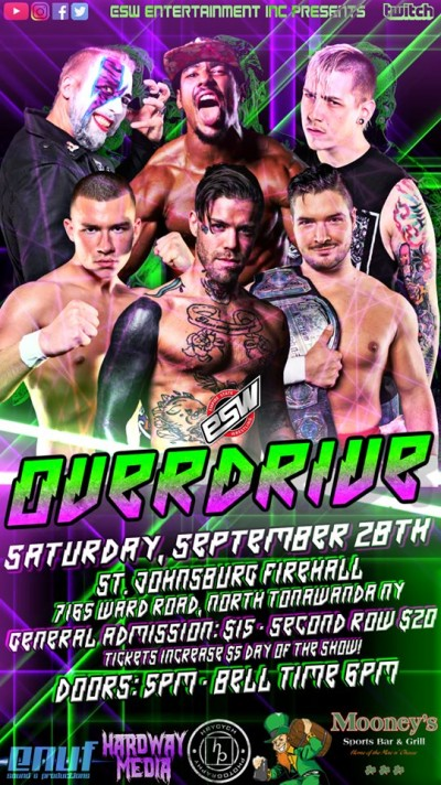 Empire State Wrestling (ESW) will return to the St. Johnsburg Fire Hall, 7165 Ward Road, North Tonawanda, NY on Saturday, September 28 for "Overdrive". Second row tickets are $20. General admission tickets are $15. Front row tickets are sold out. Doors open at 5 p.m. with bell-time at 6 p.m. "Overdrive" will be recorded for ESW’s live streaming feeds.
