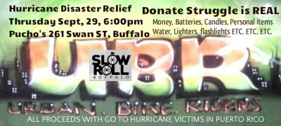 Urban Bike Riders and Slow Roll Buffalo are making a special ride starting at Pucho Olivencia Center to collect goods for the Hurricane Relief. Join them and bring some goods to help the devastation in Puerto Rico everything and anything will help. Mark your calendar this Thursday Sept 28 at 6:00pm 261 Swan Street, Buffalo