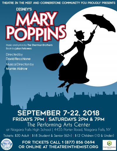 Theatre in the Mist, along with Cornerstone Community FCU presents Disney’s Mary Poppins on Friday, September 7 through Saturday, September 22, 2018 at The Performing Arts Center at Niagara Falls High School, 4455 Porter Road, Niagara Falls, NY.