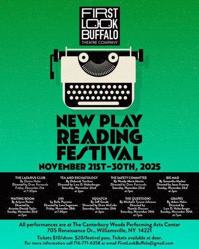 705 Renaissance Dr Williamsville, NY 14221First Look Buffalo Theatre Company’s NEW PLAY READING FESTIVAL is back for the 2025-26 season! Nine new plays over two fun-filled weekends featuring local and national playwrights. These readings are directed and rehearsed and will be presented for the first time for the public. After each reading, there will be a talkback with the audience. Two of these plays will be chosen for a full production as part of First Look’s 2026-27 season.