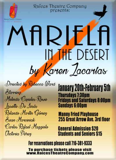 255 Great Arrow Ave. Buffalo, NY 14207Mariela and José were once the golden couple of the Mexican artists’ inner circle. Together they built a family and an artist colony to host friends Diego Rivera, Frida Kahlo, and Rufino Tamayo. But now their daughter has grown up and run away, their friends are too famous to call, and artistic inspiration has been strangled by isolation and lies. Set in the northern Mexican desert in 1950, Mariela in the Desert is a deadly mystery—a layered yet profoundly honest story of what happens to a family when creativity is forced to dry and wither away.