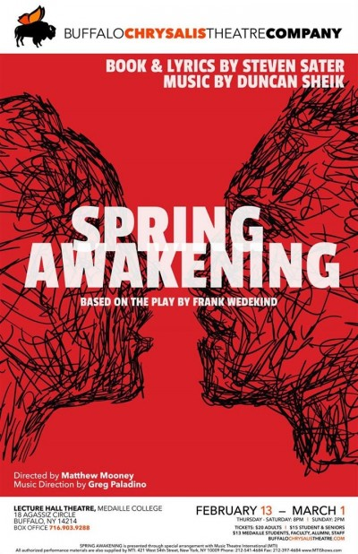 Book and Lyrics by Steven Sater Music by Duncan Sheik Based on a play by Frank Wedeking Directed by Matthew Mooney Music Direction by Greg Paladino Pop/Rock, Rated R The winner of 8 Tony Awards, including Best Musical Spring Awakening explores the journey from adolescence to adulthood with poignancy and passion that is illuminating and unforgettable. The landmark musical is an electrifying fusion of morality, sexuality and rock & roll that is exhilarating audiences across the nation like no other musical in years.