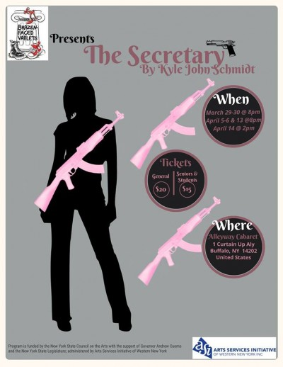 Ruby runs a small-town gun company that aims to protect women by helping them protect themselves. With products like The bridesmaid, The Babysitter and The Mallwalker, each of the company's guns is named after a woman who used a gun and saved a life--more often than not, her own. When an elderly secretary at the local high school confronts a threat in her office with six bullets, Ruby responds by naming her latest gun after the reluctant hero: “The Secretary.” But as production begins on The Secretary, guns start going off all around town--and no one’s pulling the trigger. THE SECRETARY is an offbeat comedy about safety, survival, and guns for a world that’s up in arms. Featuring: Heather Fangsrud, Stefanie Warnick, Davida Tolbert, Jeannine Giffear, Jamie Nablo, Caroline Parzy-Sanders and will be directed by Lara D. Haberberger. Costumes designed by Rachel Maggs. Performances are 3/29/19 to 4/14/19 at Alleyway's Cabaret Space - entrance on Main Street.