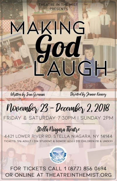 Theatre in the Mist presents the regional premiere of Making God Laugh on Friday, November 23 at the Stella Niagara Education Park 4421 Lower River Road, Stella Niagara, NY 14144