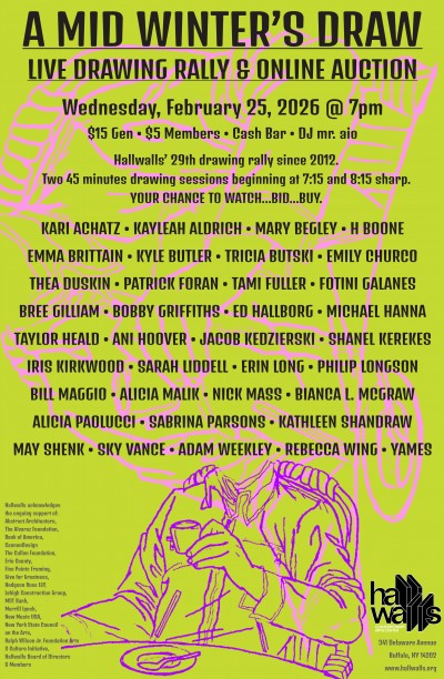 or the 29th time since February 2012, Hallwalls presents its twice year live drawing rally and online auction. A Mid Winter's Draw inserts itself into the dog days of the cold season as a warm, refreshing blast of creativity, good vibes, and abundant art purchasing possibilities. Participating artists will draw live in two 45-minutes sessions, after which drawings may be bid on for 24 hours via Hallwalls' Clickbid page.