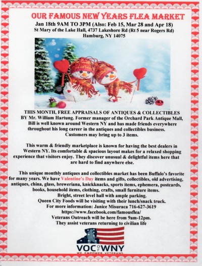 Visitors always have a happy shopping experience at Our Famous Flea Market. They discover unusual and delightful items here that are hard to find anywhere else. It’s relaxing to shop in a warm & friendly marketplace that has the best dealers in Western NY. This unique monthly antiques and collectibles market has been Buffalo’s favorite for many years. We offer free appraisals of antiques and collectibles by Mr. William Hartung, the former manager of the Orchard Park Antique Mall and the Lancaster Emporium. Visitors may bring up to three items or photos of items too large to transport.