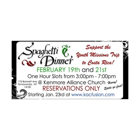 175 Bonnett Ave Tonawanda, NY 14150 THIS EVENT HAS PASSEDIt's that time again!!! The greatest spaghetti dinner you will attend in 2016 or ever has arrived. Our youth ministry is going on an overseas missions trip to Costa Rica. We have a team of 29 people going from March 17th to 25th 2016. It is going to be an amazing opportunity to partner with SCORE international as we go encourage the body of christ in Costa Rica. We will be doing a lot of work with Nicaraguan Refugees and working in orphanages. We hope you are willing to come out and support what God is doing in and through our team. The way to give is to come out for a great meal and give us a donation for your table side service and delicious meal. An envelope will be left by your server for you to give as you feel led! Sign up for one of our 6 seating times on Friday or Sunday!!! Look forward to seeing you all there!