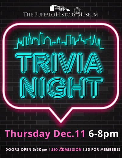 Test your knowledge of our city, pop culture, and beyond at the Museum’s Buffalo History trivia night! Bring a friend, or meet new friends for team-based Buffalo history trivia inside the State Court. Beer and wine will be available for purchase, and prizes will be awarded for the winners! Maximum of four members per team.