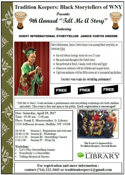 Oral storytelling workshops for adults and children, featuring special guest storyteller Janice Curtis Greene. This program is sponsored by the Tradition Keepers Black Storytellers of WNY. For more information and to register, call 716-222-3663.