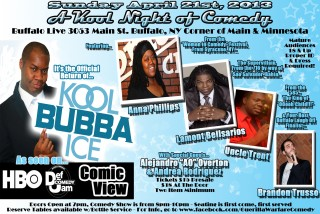 3053 Main St. Buffalo, NY 14214 THIS EVENT HAS PASSEDNational headliner and Star of HBO and Showtime, Kool Bubba Ice returns to Buffalo. Sunday April 21st, 2013 marks "A Kool Night of Comedy" with the star of HBO, Showtime, Def Comedy Jam & Comic View, Kool Bubba Ice. Comedian and Master Impressionist Kool Bubba Ice has had a long and illustrious career, with appearances on The Conan O'Brien Show, Apollo Comedy, Hardcore TV, Def Comedy Jam -HBO-3 Seasons, Comic View-Bet-3 Seasons and several other movie, television and cable appearances. He tours across the US steadily and has shared the stage with such legendary talent as Bernie Mac, Chris Rock, Cedric The Entertainer, Chris Tucker, Steve Harvey, Bill Bellamy and Paul Mooney! His high energy show leaves audiences rolling in the aisles and he always leaves the audience wanting more! Kool Bubba Ice will headline a night of incredible comedy with hilarious performers from across the state, featuring the comedic talents of Anna Phillips from Syracuse, Lamont Bellsarios, Uncle Trent from Rochester, with special guests Alejandro Overton and Andrea Rodriguez and hosted by Buffalo Laugh Off finalist, Brandon Trusso.