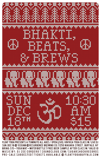 1250 Niagara St Buffalo, NY 14213Tis the season, so let's get our sweat on! Float Yoga and Resurgence Brewing Company are coming at ya, ugly holiday sweater style for our 25th installment of our popular monthly yoga+music series. Don your tackiest of holiday apparel, and get ready for a good old fashioned, groovy vinyasa flow set to a bumping soundscape mixed up fresh for us by our good friend, Zee Cordero.