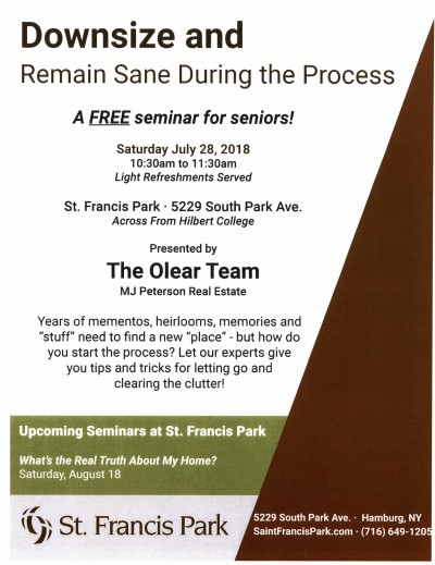 Members of The Olear Team at MJ Peterson will offer a free seminar for seniors titled “Downsize and Remain Sane During the Process” from 10:30 to 11:30 a.m. Saturday, July 28. The event will take place at St. Francis Park, 5229 South Park Ave., Hamburg, across the street from Hilbert College. Light refreshments will be served.