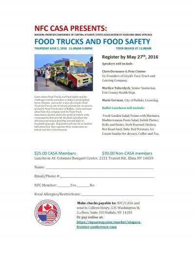 Join us for Lloyds food truck tour, buffet lunch, and a presentation: 'Food Trucks & Food Safety'. Tour begins at 11:00AM. Learn about Food Trucks and Food Safety and the challenges mobile units face in today’s world of food borne illnesses. Join us for a tour of a Lloyd’s Food Truck (will be on site at venue), provided by co-owners of Lloyd’s Food Trucks here in Buffalo. Come and hear about how this company and the Food Truck Association started, about the world of mobile units, commissaries that provide the food, and about the delicious and unique food they provide daily to hundreds of people.